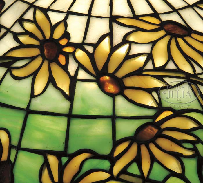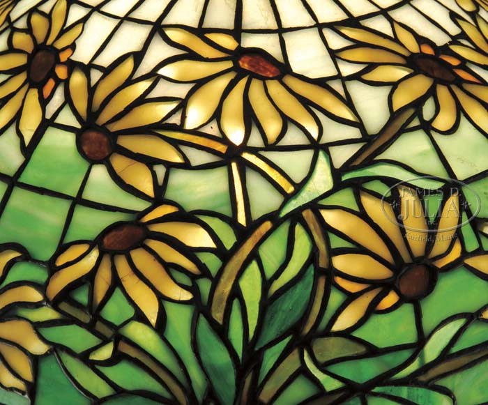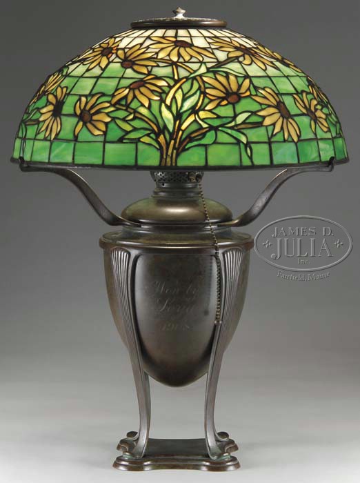 TIFFANY STUDIOS BLACK EYED SUSAN TABLE LAMP. Green and white striated brick background is decorated with an all over pattern of black eyed Susan flowers in various stages of bloom. The petals are comprised of various shades of yellow and butterscotch colored glass with each flower having a rum colored eye. Stems in a flowing art nouveau design complete the shade in green and other earthen hues. Shade is supported by a Grecian urn base with single socket and three arms. Four classical curving legs rest atop a square platform foot. Base is monogrammed on the side “Won by Loya 1908”. Lamp is completed with an original pierced can cap. Shade is signed “Tiffany Studios New York”. Base is signed on the canister “Tiffany Studios New York 11406” and on the underside of the base “18”. SIZE: Shade is 16″ dia. Lamp is 21″ t. CONDITION: Shade is very good to excellent with very few if any tight hairlines. Kerosene canister has been electrified, otherwise very good to excellent. 5-62224 (26,000-30,000)