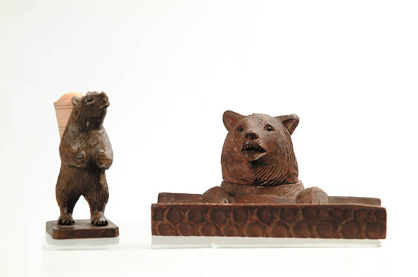 TWO CARVED BLACK FOREST BEAR, ARTICLES. 1) Carved inkwell. Bears head lifts to reveal inkwell with pen tray held by his paws. Nicely detail carving with glass eyes. Late 19th Century. SIZE: Tray is 5-1/2” l, inkwell is 3” h. 2) Small carved Black Forest bear with a pin cushion backpack. Nicely carved with glass eyes. Late 19th Century. SIZE: 3-1/2” h. CONDITION: Generally very good. 3-30381 (500-600)