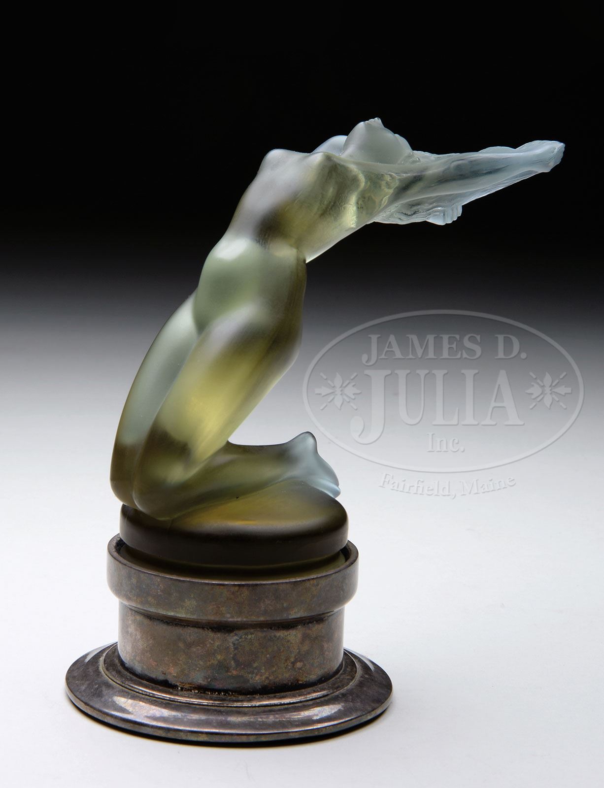 R. LALIQUE AMETHYST CHRYSIS MASCOT. Interesting Lalique Chrysis mascot has color shading from amethyst at the base to light blue at the head and hair. The mascot is signed on the underside in etched block letters “R. Lalique France”. The mascot rests on a silver-plated stand. Marcilhac 1183, pg. 505. SIZE: Mascot: 5-1/2″ t. With stand: 7″ t. PROVENANCE: From a prominent Georgia collection. CONDITION: Very good to excellent. 5-67624 (5,000-7,000)
