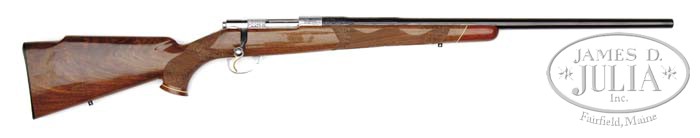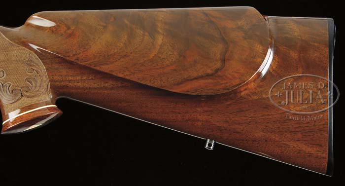 *SCARCE BROWNING OLYMPIAN GRADE BOLT ACTION RIFLE. SN 5690B7. Cal. 222. 24″ stepped slightly tapered heavy rnd bbl, made without sights. Two tapped holes with filler screws about 6″ from receiver for rear sight. Left side bbl “BROWNING ARMS COMPANY”, right side “CALIBER .222 ONLY 5690B7/MADE IN BELGIUM”. Each side of bbl at chamber has 2″ wedge of bold foliate scroll. The Sako receiver is drilled for scope bases with plug screws. Body of action has bold foliate scroll with stippled background. Left side of receiver ring is engraved with a fleeing hare and signed “J. BAERTEN”, right side has running fox. Floorplate is engraved with prairie dogs and bold foliate scroll and signed “J. BAERTEN”. Trigger guard has game bird perched on limb. Mounted with nicely figured flame-grain walnut, 45 degree contrasting forend tip with white line spacer, matching grip cap with blank gold diamond. Carved and checkered forend, carved and checkered pistol grip, Monte Carlo with left side cheekpiece, Browning hard rubber buttplate, sling swivel stud 4″ from toe matching in forend. Accompanying is a 2-pc Browning black box with gold lettering and end label for .222 heavy bbl Olympian. PROVENANCE: Private Coll. of a Gentleman. CONDITION: Extremely fine, appears test fired only. Gun retains all of its original factory finish with a tiny mark in finish at rear of Monte Carlo. Mechanics are new with a bright shiny bore. Box is in nice condition. Gun was tested with silver nitrate and shows no sign of salt. 4-41936 BDT205 (7,000-10,000)