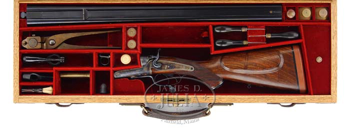 HOLLAND & HOLLAND HAMMER DOUBLE RIFLE WITH CASE AND ACCESSORIES. SN 11145. Cal. 10ga. Double triggers. Rebounding locks. Jones underlever. 27″ Dove-tailed steel bbls w/ broad flat rib w/ single standing platinum lined rear express sight, longitudinally dove-tailed front sight w/ silver and flip-up beads. The rear portion of the rib is file cut and terminates in a large dolls head extension. The bbl is engraved “Holland & Holland, 98 New Bond Street. London.” on the top of the right bbl and “Winners of all the “field” rifle trials. London. 1883.” on the left. The bbl flats are stamped w/ Birmingham black powder re-proof marks for 3-1/4″ chambers “103 grains black powder” and “1031 Grs bullet”. The bottoms of the bbls are stamped SN “1145” (1892). The case hardened action has back action side locks w/ rebounding low profile hammers and Jones underlever, and is border engraved. The trigger guard is engraved w/ SN “11145”. The lightly streaked and figured English walnut full pistol grip buttstock measures 14-1/2″ over a Silvers type pad and features eyes for sling, vacant silver oval on toe line, cheek piece for right handed shooter, steel pistol grip cap, and 16 LPI borderless checkering. The splinter forend has a lever release and is checkered to match buttstock. Drop at heel: 2″, drop at comb: 1-5/8″. Weight:11 lbs 8 oz. Oak and leather case has brass corners, round central medallion on the lid. Dark red velvet interior w/ Holland & Holland label. Accessories include 2 brass oil bottles no. 11145 stamped on the tops, 3 ebony handled turn screws, brass striker case, bone parts bottle, 2 brass 10 bore snap caps, 10 bore wad cutter, rosewood handled whisk broom, BGI recapper, ring type stuck case remover, 2-pc ebony cleaning rod, and a large brass single cavity 10 bore conical bullet mold w/ base plug stamped w/ initials “J.G” and no. “11145.” There is one empty brass cartridge case, a chamber cast, and some wads. PROVENANCE: Transcription of a letter from Holland & Holland dated Mar 3, 1999 w/ particulars of gun, and a copy of the record book showing that the rifle was made for a Mr. Lethbridge. CONDITION: Excellent as refurbished. Letter of provenance states that after its last trip to Africa, at which time it took 2 cape buffalo, this rifle was returned to Holland & Holland to be redone. It has not been taken on a hunt since that time. Rifle currently exhibits a condition commensurate w/ that statement, but shows a few very light handling marks in wood. There are a couple small chips of wood missing from the forend in front of the bottom of the forend iron, and behind the take down lever. The action is tight and on face. Bores are very strong, shiny, but w/ scattered light pitting throughout. Case is very fine w/ smooth leather w/ a few scuffs. Interior partitions are tight. Velvet is clean. Accessories are very good. These large caliber bore rifles are fairly scarce. This one cries to go back to Africa. 4-33446 MGM32 (17,500-27,500)