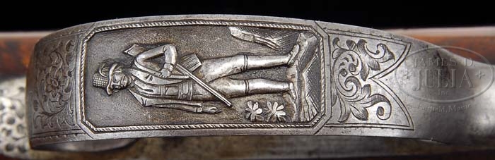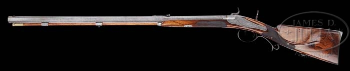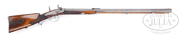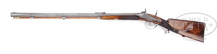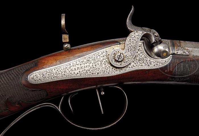 FR. GAREISS PERCUSSION STALKING RIFLE. SN NSN. Cal. 60 Cal. 32″ Deeply swamped octagon twist barrel has bands of gold and silver at muzzle and breech. Rear sight is graduated from 100 to 300 yards with sliding toggle to elevate. Front sight is dovetailed through end of bbl. Breech plug has finely executed open scroll engraving with vented gold blowout. Breech iron has matching scroll, folding steel peep sight, and letters “KK” inlaid in gold. Right hand back action lock is marked “Fr. Gareiss” with nearly full coverage of open flowing scroll. Flat hammer has matching scroll on sides, and terminates in relief engraved dolphin head with large bug eyes with gold pupils. Left side of stock has side plate mirroring shape and engraving of lock plate which is engraved “In Heinrichsgrun”. Trigger plate and matching thimble have very stylized pineapple with open scroll engraving. Set trigger consists of typical rear set with pin type release. Trigger guard is scrolled pistol grip type with high relief engraving of Jaeger carrying rifle on bow. Figured European walnut stock has steel butt plate with scroll engraving that matches action, acanthus carved sliding wooden patch box with button release, large button type sling retainer, sweeping right hand cheek piece, and 18 LPI checkering with foliate shaped single lined border. Bbl attaches to forend with side nail through engraved German silver escutcheons. Hickory ramrod has brass ends. Weight: 7 lbs. 10.6 oz. LOP: 13-5/8″. CONDITION: Good. All metal is cleaned to silver. Stock shows most of what appears to be original finish with numerous nicks and dings, and areas of wear. Ramrod appears to be old replacement. Bore is strong, but needs cleaning. Set trigger works. Lock is crisp. Interesting rifle showing a high standard of workmanship. 4-37563 MGM54 (4,000-6,000)
