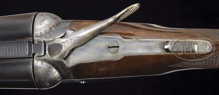 *RARE PARKER GHE SKEET SIDE BY SIDE SHOTGUN. SN 240305. Cal. 16 ga. 26″ bbls, with matted tapered concave rib, dual ivory sighting beads, SKEET IN/SKEET OUT choke, ejectors and Parker sgl selective trigger. Top rib of bbl is marked “PARKER BROS. MAKERS.MERIDEN C.T. U.S.A. PARKER SPEC. STEEL”. The “1” size frame is engraved in standard “G” pattern with moderate foliate scroll, an oval with 2 ducks in flight on left side and 2 quail on right side with “PARKER” engraved across center of bottom and a circle with 2 pheasants on trigger plate. Mounted with nicely figured flame grain walnut, checkered straight grip, checkered butt, blank gold initial shield, checkered beavertail forend. Bore diameter: left -.664, right -.664. Bore restrictions: left -.006, right -.004. Wall thickness: left -.029, right -.029. Drop at heel: 2-1/8″, drop at comb: 1-1/2″. Weight: 7lbs. 3oz. LOP 14-1/4″. The book “Parker Gun Identification & Serialization” identifies as “G” grade gun, 16 ga., 26″ bbls, with ejectors & sgl trigger, and capped pistol grip. Inspection of bbl flats reveled 2 Remington date codes KF (May 37) & XG (December 38). CONDITION: Fine. Bbls retain 98% of a fine factory quality restored blue finish, some minor muzzle wear, a few minor nicks & scratches and a small area on left bbl of very tiny surface oxidation spots as well as some thinning in chamber area. Receiver has crisp engraving and retains visible thinning colors blending throughout with a silver patina. Trigger guard retains most of a fine restored blue finish. Stock is sound with a tiny hairline crack on left side at receiver and has a professional barely visible repair through wrist, some minor nicks & scratches and retains most of a fine hand rubbed restored finish. Forend is sound with sharp checkering, a few minor handling marks and retains most of its fine restored hand rubbed finish. Mechanics are crisp with non-auto safety with strong ejectors and nice shiny bores. 8-87614 (7,500-10,000)