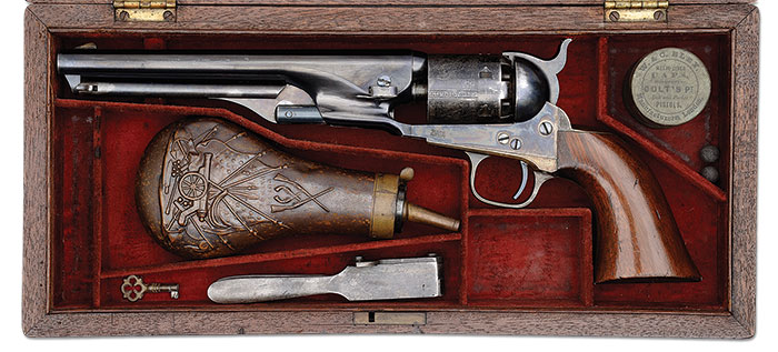 SCARCE CASED COLT MODEL 1861 NAVY PERCUSSION REVOLVER. SN 36300. Cal. 36. Blue & color case hardened with 7-1/2″ rnd bbl, German silver front sight and 1-line New-York U.S. America address. Left side of frame is marked “COLTS PATENT” and left shoulder of trigger guard has the caliber marking. The silver plated brass trigger guard & backstrap contain a fine, varnished, 1-pc walnut grip with last four digits of matching SN in backstrap channel. Cyl is usual 6-shots with Ormsby Naval battle scene roll marking and all six safety pins are crisp & serviceable. Accompanied by an orig, burgundy velvet lined mahogany Colt casing, partitioned in the bottom for the revolver, a sgl-sided, angle-spout “COLTS PATENT” mold with trophy of arms & flags, a blued steel 2-cavity “COLTS PATENT” mold with sprue cutter, marked on right side “36B”. Sprue cutter is dbl stamped. Also accompanied by a packet of “COLT’S CARTRIDGE WORKS” combustible cartridges, a cap tin and a functioning key. According to Flayderman’s Guide to Antique American Firearms there were only 38,843 of these scarce revolvers produced in the period 1861 thru about 1873. The Model 1861 is regarded as Colt’s most beautiful percussion handgun. The majority of the Model 1861 production saw hard service throughout the Civil War and later on the western frontier, usually under harsh conditions with little or no maintenance and are rarely found with high orig finish. Cased examples are exceedingly rare. This revolver, having been manufactured late in production, would almost certainly have belonged to an American pioneer who apparently used it very little, if at all. PROVENANCE: Dr. John M. Pickup Collection. CONDITION: Extremely fine plus, all matching except wedge which is unnumbered. Bbl retains 95-96% glossy orig blue with faint sharp edge wear and a flaked spot on right side of muzzle, a series of small dents by the wedge slot on right side and a couple of minor scratches; rammer & handle retain just about all of their orig, dark case colors; frame & hammer retain about all of their brilliant case colors; cyl is probably unfired showing about all of its orig blue on the face and in the chambers; exterior of cyl retains about 50-60% orig blue with the losses flaked, not worn to a light patina; screws retain virtually all of their bright orig blue with no evidence of having been turned; trigger guard retains about 60% orig silver and the backstrap about 40%. Grip is sound with a few, very light nicks in the finish, very light sharp edge wear and overall retains about all of its bright orig varnish. Mechanics are crisp, brilliant shiny bore. Case is sound with usual light handling & storage marks with some light finish wiped on front edges; interior is lightly faded with minor soil in the lid, moderately faded & soiled in bottom, partitions are solid. Flask retains 65-75% orig finish and the mold about 60% thin orig finish with crisp cavities and a spot of deep pitting on left arm; cartridge box & cap tin are fine. 4-46403 JR86 (17,500-27,500)
