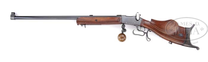 *EXTRAORDINARILY RARE HAMMERLI/SPRINGFIELD INTERNATIONAL MATCH RIFLE. SN 473. Cal. 30-06. According to the book The Springfield 1903 Rifles, Brophy, after the 1927 International Competition, the Ordnance Department purchased ten of these rifles and refitted them with the Springfield 31″ heavy rnd bbls, 1″ across the muzzle and 1.189″ at the receiver. Bbl is mounted with the orig Swiss globe front sight and target scope blocks. Receiver is mounted with a Lyman 48 target sight and front of receiver has its orig multiple adjustment palm rest also fitted with dbl set triggers and an elaborate Schutzen style trigger guard. Buttstock is also Schutzen style with flared side panels, a heavy perch belly and massive Schutzen style cheekpiece with checkered thumb rest on right side. According to Brophy these rifles came with two different shaped Schutzen style buttplates fitted to each rifle. The forestock is uncheckered with a small schnable tip and hand rest rail on bottom which contains a sling loop with a corresponding loop on the buttstock. Forestock has been retrofitted with a screw to replace the orig key and there is an extra hollow space in the bbl channel which some of the shooters used to store an extra main spring or firing pin, all of which is mentioned on pp. 128-129 of the above cited publication. Also, according to Brophy, there was a total of about ten of these fine match rifles purchased for the U.S. International Shooting Team with others being sold by DCM through the NRA. This is an extraordinary find, rarely ever encountered. Consignor states that the gun will letter through Springfield Research. CONDITION: Very fine plus. Bbl retains 96-98% strong orig blue and receiver about 95% orig blue with some freckles of light rust and slightly battered screws. Wood is sound with minor nicks & scratches and a hairline in the buttstock behind the buttplate attaching pin escutcheon and overall retains most of its fine orig hand rubbed oil finish. Mechanics are crisp, very bright shiny bore. 4-35312 JR335 (9,500-11,500)