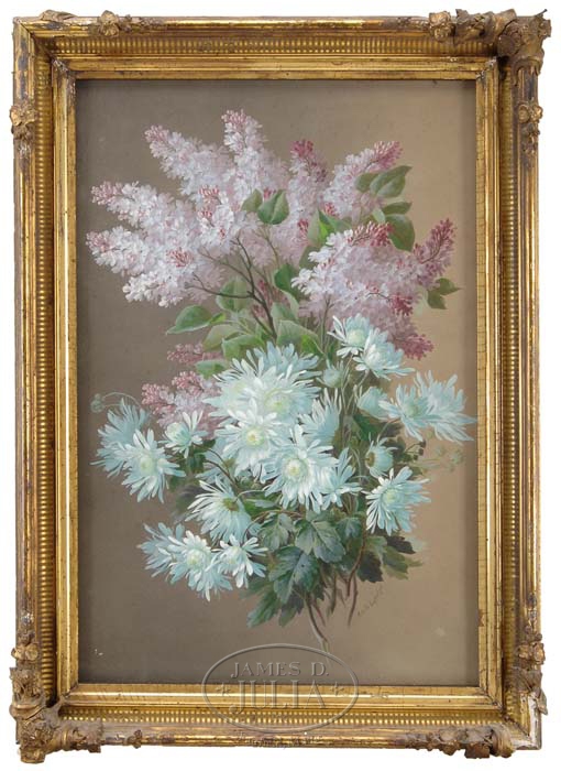 PAUL DELONGPRE (French/American, 1855-1911). Gouache on paper laid on canvas still life scene shows an arrangement of purple lilacs and white flowers against a brown background. The group of flowers is free floating. Signed just below the stems “Paul DeLongpre”. Housed in a gesso decorated gilt frame which is as is. SIZE: 28-1/2” x 20-1/2”. CONDITION: Very good with some minor foxing. 9-71565 (5,000-8,000)