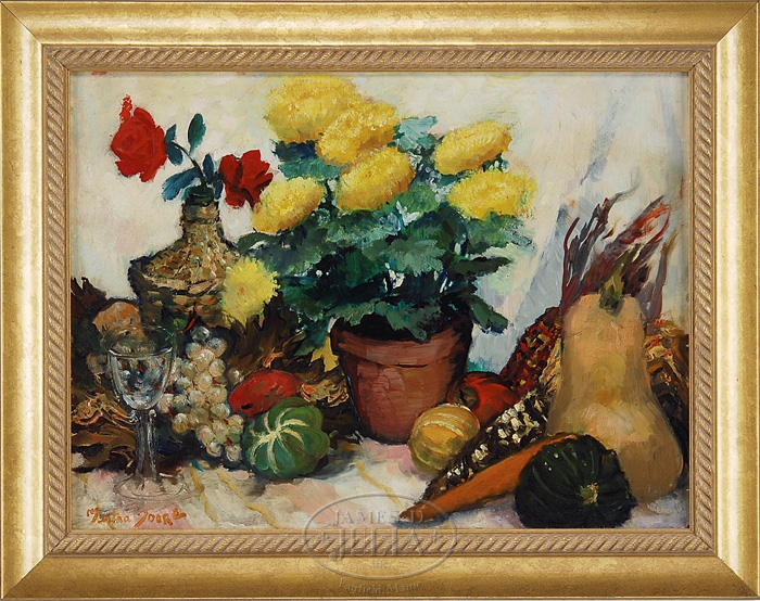 MARTHA ELIZABETH MOORE (American, 1913-1982) AUTUMN HARVEST. Oil on board still life scene shows fall vegetables and flowers in an attractive setting. The composition includes a jug of red roses, a pot of yellow mums, gourds, grapes and corn. Signed lower left. Housed in a modern gilt frame. SIZE: 18″ x 24″. CONDITION: Very good. 9-97150 (500-800)