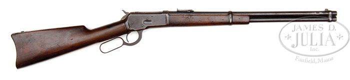 *VERY RARE SMOOTH BORE WINCHESTER 1892 SADDLE RING CARBINE. SN 167239. Cal 44 WCF. 20″ carbine bbl with no. 44 sporting leaf rear sight and pinned brass blade front sight. This scarce carbine has smooth bore which is seldom seen and often used by exhibition shooters. Carbine forearm and stock of plain walnut with steel carbine buttplate. CONDITION: Bbl and action blue has faded to patina with an area of pitting near muzzle. Forearm has a crack forward of band and shows heavy handling marks. Stock has small cracks behind lower tang and left side of receiver with worn finish and handling marks. Stock has small gaps in fit at receiver. Action has good mechanics. Bbl has light pitting most prominent closer to the muzzle. 4-38237 DS13 (4,000-6,000)