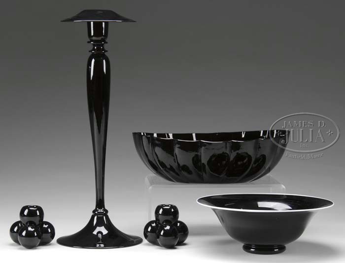 FIVE STEUBEN MIRROR BLACK ITEMS. Lot consists of vertical ribbed banana bowl which is unsigned, a footed bowl with white applied rim signed with an acid etched Steuben fleur de lis, a pair of candlestick holders signed with acid etched script “Steuben” and a large single candlestick with flaring rolled rim signed with an acid etched Steuben fleur de lis. SIZE: Candlestick is 17-1/2″ t. CONDITION: All items are very good to excellent. 5-61684 (300-500)