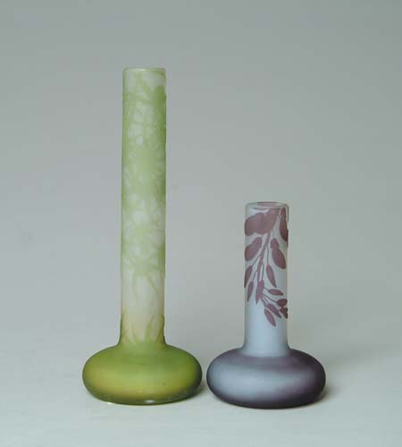 TWO CUT-DOWN GALLE VASES. Lot of two Galle vases have been cut down. 1) Purple buds against a frosted background. Signed on side in cameo “Galle”. SIZE: 5-1/2″ t. CONDITION: Very good except as noted. 2) Lime green cameo thistle design against a frosted light pink to cream background. Signed on side in cameo “*Galle”. SIZE: 9″ t. CONDITION: Some minor scuff marks to edge of foot, otherwise good except as noted. 5-70141 (400-600)