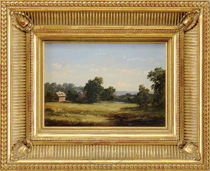XANTHUS RUSSELL SMITH (American 1839-1929) LANDSCAPE WITH HOUSES AND FIELD. Oil on canvas small landscape scene shows a field leading to a farmhouse with large barn nestled amongst trees under blue and white cloud sky. Signed on reverse “X.S. 1860″. Housed in a fine reproduction antique frame with glass. SIZE: Sight: 5″ x 7-1/4”. CONDITION: Very good. 9-26993 (2,000-4,000)