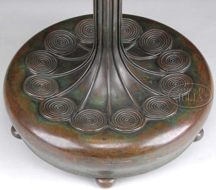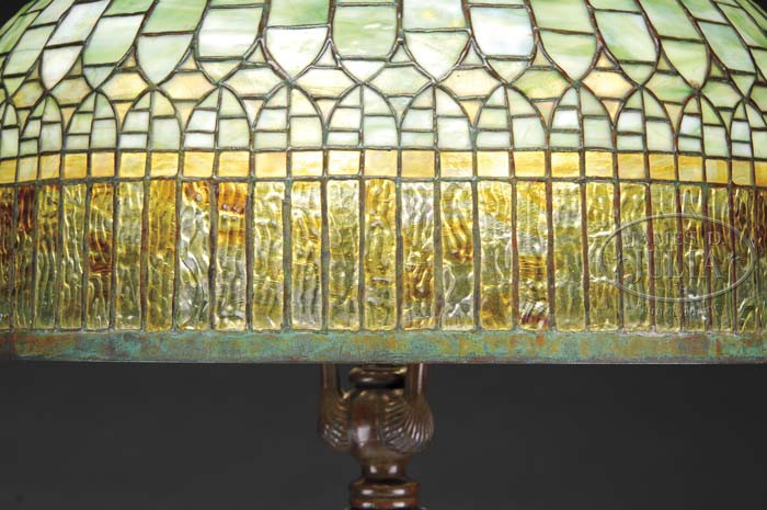 TIFFANY STUDIOS CURTAIN BORDER FLOOR LAMP. This curtain border design is one of the most popular patterns ever created by Tiffany Studios and was one of the first designs and transcended through all the production years of Tiffany. This handsome shade begins with heavily striated green panels of glass in a vertical feather design. There is a single geometric row of translucent green and amber striated glass just above the vertical rectangular panels of heavily rippled glass in various shades of yellow and rum. Shade is supported by a senior decorated floor base with six swan head sockets. Supporting the shade are three arms that end with a shell design set above a ribbed floor stem that ends in a decorated padded platform base with four feet. The base carries a highly desirable original patina finish. The lamp is completed with a pigtail top cap with matching patina finish. Shade is signed “Tiffany Studios New York 1515-17”. When a shade was signed with a dash number by the studio, it is believed that they felt it to be an extraordinary example. Base is unsigned. SIZE: Shade is 24″ dia. Lamp is 77″ t including top cap. CONDITION: Shade is very good to excellent with very few if any tight hairlines. Base has replaced bottom plate, new sockets and two broken pull chains. 5-62189 (50,000-70,000)