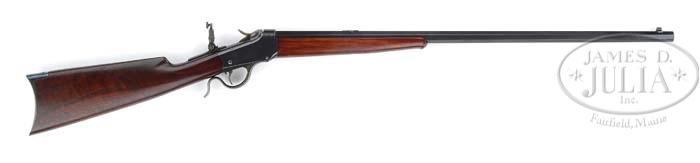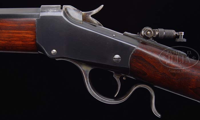*WINCHESTER 1885 LOW-WALL SINGLE SHOT RIFLE. SN 96896. Cal 25-20 S.S. 28″ No. 1 oct bbl, Lyman ivory bead front sight, slot blank in rear seat, top of bbl is marked “MANUFACTURED BY THE / WINCHESTER REPEATING ARMS CO. NEW HAVEN.CONN.U.S.A.”. Chamber marking adjacent receiver is “25-20 S.S.”. Standard 85 low-wall receiver with single set trigger and Marbles tang mounted peep sight. Mounted with nicely figured straight grain walnut, uncheckered schnauble forend with ebony tip insert, unchecked straight grip stock with steel crescent buttplate. CONDITION: Extremely fine. Bbl retains 98-99% orig blue with faint sharp edge wear and minor nick or two and a rub on the top flat behind rear sight seat. Receiver retains 97-98% orig blue with some minor flaking to silver on top left side and some faint sharp edge wear. Block, hammer and lever retain very strong orig case colors with some light thinning across bottom of lever. Stock is sound with only a few minor handling marks and retains a smooth hand-rubbed oil finish. Forend is sound with a couple minor handling marks and retains a fine, smooth hand-rubbed oil finish. Mechanics are crisp with functioning set trigger and a nice shiny bore. 4-37458 (2,450-3,450)