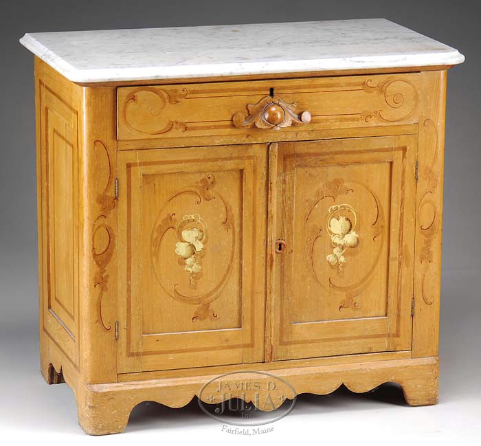 Additional Information: The catalog photo is wrong. The piece is not photographed. VICTORIAN MARBLE TOP PAINT AND STENCIL DECORATED ASH COMMODE. Circa 1860. The white marble top with beveled edge and round corners above the conforming case, fitted with a long drawer and carved central handle, above a pair of cupboard doors, the whole with scrolling stenciled trim and painted fruit decoration, on a molded base with scalloped apron and bracket feet. SIZE: 28-1/2″ h. x 31″ w. x 17-1/2″ d. PROVENANCE: From the Estate of Geraldine Gaba, Scottsdale, AZ. CONDITION: Good overall; marble splash-guard and backboard absent. 9-94869 (250-350)