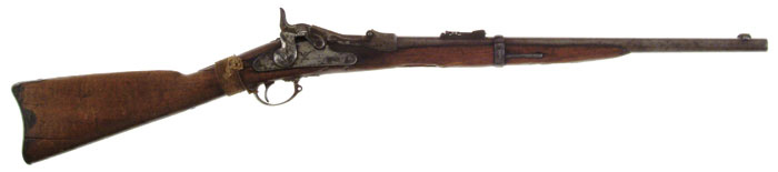 INDIAN USED SPRINGFIELD TRAPDOOR RIFLE PURPORTED TO BE USED AT THE BATTLE OF LITTLE BIG HORN. Cal. 45-70. SN 38853. This rifle is recorded as having been turned in during the second quarter of 1877 as an unserviceable carbine by Capt. Benteen, Commander of Company H, under Custer at the Fight at the Little Big Horn, where Custer & 207 of his men were annihilated. This cut down rifle, listed as a carbine, was among thirteen Springfields turned in by Capt. Benteen. It is now described as having a 21-1/4” bbl with a dovetail front sight, having a homemade, and German silver blade with a 1,200 yard rear sight. Breechblock & lockplates have the correct 1873 markings. The orig 1-pc stock has been reduced to 32-1/2” overall with one remaining band and shows incredible, extensive, hard use. The area of the forestock, between front of lockplate & band is severely worn from riding across a saddle bow, completely into the ramrod channel. It was shattered through the wrist & now has a braided, cord wrapped repair. There is also a crack through lower buttplate screw, completely around toe. Side opposite lockplate also shows heavy wear with severe wood loss around receiver which is duplicated on right side also. Left side has a crude, carved “LF” connected brand. The true story of this cut down rifle may never be known. It seems likely that official records of Capt. Benteen’s turned in unserviceable carbines should be considered accurate and one could easily mistake this for a carbine. Therefore, extrapolation to a Custer Battlefield used firearm is easy to make. There is also the possibility that this is one of the Models 1873 turned in for refurbishing or disposition in 1879. A large portion of those turned-in 1873’s were stripped for serviceable parts & sold as salvage, thereby creating a secondary market for rebuilt trapdoors using orig parts. Thereafter it could have wound up in an Indian’s hands on the frontier. There are a number of scenarios as to how it could have wound up in the condition it is, but the most logical & compelling is that it was in the hands of one of the Indian warriors at the Custer fight. CONDITION: Poor. No orig finish remains with metal being a worn, thin, silver/brown patina with rust & stain on left side of bbl. Stock is the most worn piece of walnut this cataloguer has ever seen. The shattered wrist was nailed & screwed before being wrapped with cord. Buttplate is very deeply pitted. Mechanics are fine; very worn, dark bore. 4-60697 (40,000-70,000)