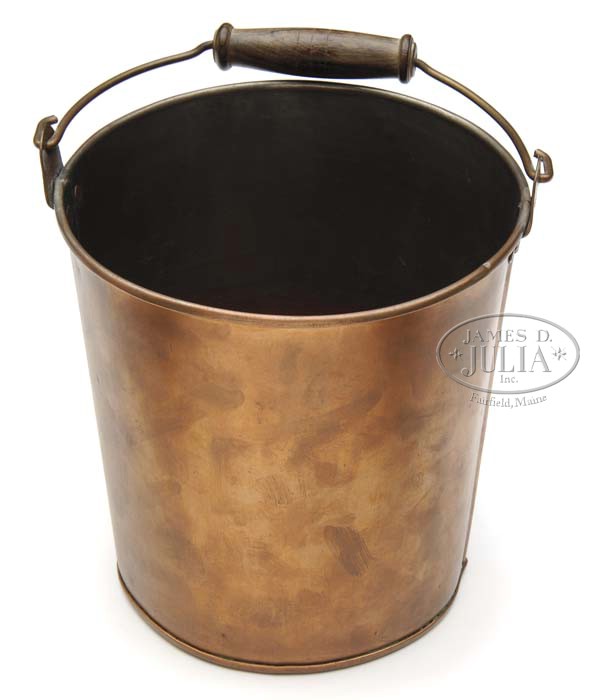 UNBELIEVABLY BEAUTIFUL COPPER MOP BUCKET BY WILLIAM SCAGEL. It is difficult to believe so much artistic talent and creativity would go into making a mop bucket. He made this bucket in 1938 for a woman friend of his who was a maid, who worked at the old Occidental Hotel in Muskegon. It is pictured on page 178 of Scagel Handmade by James R. Lucie on the right side. The Bail hangars on both sides are very well marked. “W. Scagel” and a sharp prominent Kris stamp are on both sides. PROVENANCE: Dr. Jim Lucie Collection. CONDITION: Excellent, like-new condition with no dents or damage. Decorative-turned wood handle on bail is in perfect condition. This has to be the “ultimate” bucket. 4-46223 JL9 (1,000-1,500)