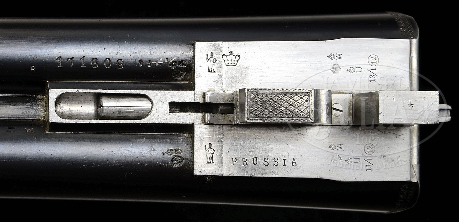 *J. P. SAUER GRADE 40-E BOXLOCK EJECTOR SELECTIVE SINGLE TRIGGER GAME GUN. SN 171609. Cal. 12 ga. 2-3/4″ Chambers. 30″ Shoe lump bbls with slightly raised, matted, concave rib, mounted with two ivory beads, are engraved “J. P. Sauer & Son” on tops of each bbl, with “FLUID – STEEL” and “KRUPP – STEEL” around breech ends which are also geometrically engraved. Bbl flats are stamped with imperial German proofs, caveman logos, a crown, and “PRUSSIA”. Case hardened scallop-backed action is marked “MADE in PRUSSIA” and has SN on water table. Action features single selective trigger with selector on top tang marked “Left” and “Right”, safety being a large piece of steel which pivots around front post of trigger guard bow extending around and unlocking trigger when in left position, easily operated by trigger finger. Action also features intercepting safety sears, crossbolt third fastener, and side clips. Action is engraved with nearly full coverage well cut, large, open, shaded, acanthus scroll with floral highlights, surrounding vignettes of well rendered feathered game in nicely detailed, finely shaded backgrounds; a pair of woodcock are on left side, two flushing ducks on right, and a cock and hen pheasant on trigger plate. A standing duck is on trigger guard bow. SN is at tip of tang. “J. P. Sauer & Son” is on a riband on each side of action. Finely marbled and lightly figured European walnut full capped pistol grip buttstock measures 14-1/8″ over thin, red, Pachmayr rifle pad, and features checkered side panels, horn grip cap, point pattern checkering with line border, and a vacant gold shield on toe line. Matching splinter ejector forend with nicely shaped, slightly schnabeled horn tip, has Deeley release. Bore diameter: left-.722, right -.722. Bore restrictions: left -.032 (Full), right -.019 (IC). Wall thickness: left -.037, right -.040. Drop at heel: 2″, drop at comb: 1-1/4″. Weight: 7 lbs. 14 oz. LOP: 14-1/8″. Included with gun is chrome trimmed black plastic case lined in blue cloth. CONDITION: Excellent. Bbls retain over 90% of their orig satin blue. Action retains a considerable amount of its orig case hardening color, highlights of engraving mostly silvered. Percentage of case hardening color is difficult to assess but is strong in protected areas. Stocks retain most of their orig finish with some extra oil being rubbed into butt. Bores are excellent. Action is loose with forend removed, but tight with forend installed. Ejectors are in time. Trigger works, but seems slightly balky in right/ left position. Being, as found, gun could use a good cleaning. Case is good. 4-49696 MGM294 (4,000-6,000)