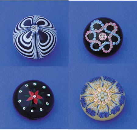 FOUR SCOTTISH PAPERWEIGHTS. 1) Selkirk paperweight of a red clematis, original paper label. Signed on base. SIZE: 2-1/4” dia. CONDITION: Very good to excellent. 2) Selkirk marbrie paperweight in colors of blue and white, original paper label and signed on base. SIZE: 2-1/2” dia. CONDITION: Very good to excellent. 3) Perthshire spoke weight, original paper label. SIZE: 2-1/4” dia. CONDITION: Very good to excellent. 4) St. Kilda pattern millefiori with interlaced millefiori trefoils. Signed with signature cane. SIZE: 2-1/4” dia. CONDITION: There is a chip on the surface. 5-69039-602 (300-500)