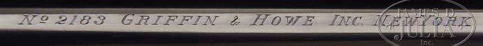 *GRIFFIN AND HOWE MAUSER MANNLICHER CARBINE WITH SCOPE AND CASE. SN 2183. Cal. 30-06. 20″ Round barrel is engraved “No. 2183 Griffin & Howe Inc. New York” on top and “30/06 – Gov.” at rear, and features stippled ramp front base w/ longitudinally dovetailed brass bead front w/ hood. FN type model 98 action has checkered bolt knob, stippled top receiver, button detachable floor plate, wing safety, Lyman 48 receiver sight base w/ blank slide (Aperture slide is in case), and Griffin and Howe scope mount. Single stage trigger is checkered. Full pistol grip lightly streaked European walnut full length stock measures 13-3/4″ over checkered steel M 70 type butt plate, and features classic G & H shadow line cheek piece, steel grip cap, ebonite forend tip, barrel band sling swivel base, vacant silver oval, and very nicely executed 20 LPI checkering w/ double line and mullered borders. Weight: 7 lbs 8 oz. Weight w/ scope: 8 lbs. 5oz. Scope is a 4X Kollmorgen in Griffin and Howe rings. Green canvas full length case w/ leather corners has green baize interior w/ Griffin and Howe paper label. Accessories include early crystal glass cork stoppered oil bottle, Boyt leather sling w/ QD swivels, aperture slide for rear sight, case straps, and key. CONDITION: Excellent, near new, with only a very few minor marks on metal and wood. Bore is excellent. Scope is excellent, optics somewhat cloudy. Case is as new. 4-36274 MGM37 (5,000-8,000)