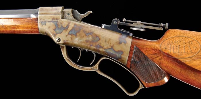 MARLIN BALLARD NO. 8 UNION HILL SINGLE SHOT TARGET RIFLE. SN 26473. Cal. 32-40. Beautiful target rifle with 30″ middle weight oct to rnd bbl with windage globe front sight, no provision for a rear sight and mounted with a mid-range vernier tang sight with 3″ staff. Receiver, breech block, lever & hammer are color case hardened and it has dbl set triggers & full loop lever. Mounted with nicely figured, slab-sawed American walnut with diamond checkered semi-schnable tip forearm and serpentine grip on the checkered pistol grip with sweeping cheekpiece and nickeled brass offhand buttplate. This exact rifle is pictured on p. 270 as Plate 34-3 in the book Ballard: The Great American Single Shot Rifle, Dutcher. These fine rifles were one of, if not the most popular models in the Marlin Ballard line and were produced only from 1884-1890. PROVENANCE: Stephen Gordon Collection; A.I. McCroskie Collection; Jack Houchen Collection; John Dutcher Collection. CONDITION: Extraordinarily fine, as new. Retains virtually all of its orig factory finish to both metal & wood with strong bright blue on the bbl, slightly faded but very strong case colors on receiver, lever & other parts. Wood is sound with minor nicks & scratches. Mechanics are crisp, brilliant shiny bore. Essentially a new rifle. 4-37631 JR106 (10,000-15,000)