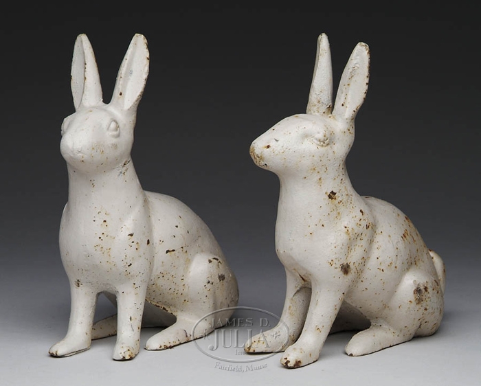 PAIR OF CAST IRON VICTORIAN STYLE RABBITS. These fanciful garden ornaments are painted in white and show the rabbits with ears up and in seated position. Late 20th Century. SIZE: 10-1/2” h x 9-1/2” l. CONDITION: Some rust, generally very good. 9-29209 (150-250)