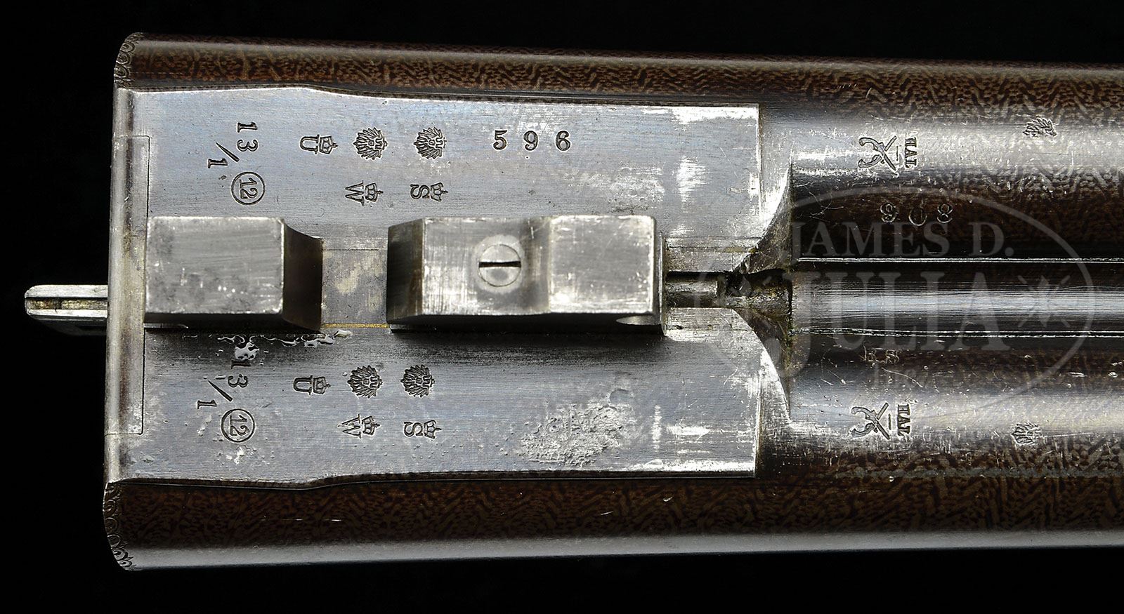 VERY EARLY LINDNER CHARLES DALY DIAMOND QUALITY HEAVY GAME GUN. SN 596. Cal. 12 ga. 2-3/4″ Chambers. 30″ Beautifully patterned Bernard Damascus bbls with raised, concave game rib mounted with two ivory beads, are engraved “Charles Daly Extra Fine Damascus Barrels Diamond Quality” on unmatted portion of rib. Bbl flats are stamped with German imperial black powder proofs and bottoms of bbls with HAL crossed pistol logos. Case hardened, slightly scalloped, boxlock action features early type square crossbolt third fastener (where bolt protrudes from side of left fence when open), pin type cocking indicators, and checkered double triggers. Action is engraved with 70 – 80% coverage well cut shaded small scroll with geometric outlines and borders. Vignettes of game are on bottom of action and trigger guard bow. A doe and deer are in mountainous scene on floorplate, with pair of snipe toward front of action. A setter points a pair of pheasant on trigger guard bow. “Charles Daly” is on scrolled ribands on either side of action. Lightly marbled and figured European walnut semi-pistol grip buttstock measures 14″ over orig checkered horn buttplate. Side panels are checkered, and there is point pattern checkering at grip, and a vacant gold shield on toe line. Matching splinter forend has scalloped horn tip and Deeley type release. Bore diameter: left-.719, right -.718. Bore restrictions: left -.023 (Mod), right -.024 (Mod). Wall thickness: left -.040, right -.041. Drop at heel: 1-7/8″, drop at comb: 1-3/16″. Weight: 7 lbs. 9 oz. LOP: 14″. CONDITION: Excellent. Bbls retain over 95% orig Damascus finish with a few minor nicks and marks, slightly thinned at normal carry area. Action retains 85 – 90 % orig case hardening color, silvering slightly on beads and bottom. Buttstock has broken through from rear of top tang around left side, to bottom tang, and been professionally repaired … does not flex. Stock refinished with rubbed oil retains most of that finish with some minor marks. Finish on forend seems to be original, checkering slightly worn. Bores are excellent, bright and shiny throughout, with one minor ping visible in right bbl. Action is tight. Bbls are on face. A very fine gun with great “modern” dimensions. 4-48994 MGM55 (4,500-6,500)