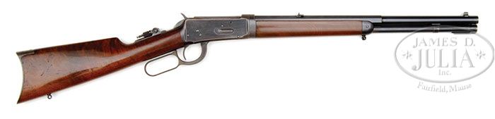 VERY RARE WINCHESTER MODEL 1894 SPECIAL ORDER TAKEDOWN SHORT RIFLE. SN 81733. Cal. 30 WCF (30-30). Standard grade rifle with rare 19″ oct to rnd bbl, full magazine, Lyman ivory bead front sight, Lyman 6A 2-leaf folding rear sight and a locking Lyman tang sight. Rifle is also takedown configuration. Mounted with uncheckered, very nicely figured American walnut with straight stock & crescent buttplate. Accompanied by a Cody Firearms Museum records research sheet identifying this rifle with 19″ half oct bbl, takedown with plain trigger. Received in warehouse Jan. 24, 1900 and shipped next day to Order #50585. Although the letter shows shipping in 1900 the receiver was actually produced in 1897. CONDITION: Fine to very fine. Bbl & magazine tube retain 95-96% strong orig blue with only sharp edge wear and some very slight thinning over chamber area; takedown ring is mostly a blue/gray patina; receiver retains about 75-80% orig blue, strong but thinning on the sides and over the top, mostly turned silver on bottom; hammer retains strong case colors turned silver on top edge; lever retains very bright case colors on sides, faded on outer faces; buttplate is gray metal patina. Wood is sound with handling nicks, dings & scratches on the buttstock which retains 95-96% strong orig varnish; forearm retains about all of a fine Winchester style restored finish. Mechanics are crisp, very bright shiny bore. 4-41543 JR236 (5,000-7,000)