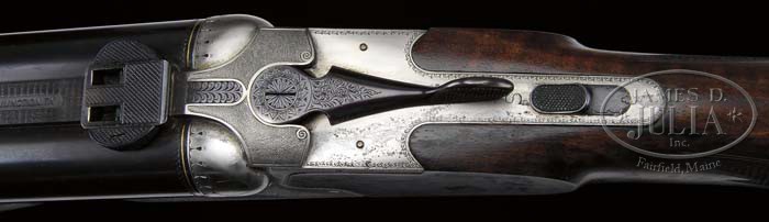 ADDITIONAL INFORMATION: There is a small hairline on the right side of the stock behind the lock. *F. W. HEYM 88B BOXLOCK EJECTOR DOUBLE RIFLE WITH SCOPE. SN 81883. Cal. .458 WIN. Mag. 25″ Shoe lump barrels have matted quarter rib marked “Paul Jaeger Inc. Grand Junction. TN” on unmatted portion between claw mount bases, which are matted with diamond pattern. File cut express rear sight has one standing and three folding leaves marked for 50, 100, and 150 yards. Silver bead front sight is longitudinally dovetailed into nicely shaped ramp. Tops of bbls are stamped “Made in W. – Germany” and “Krupp Special (logo) Laufstahl”. Rear of bbls and bolsters have inlaid gold line and border engraving. Bbl flats have German nitro proofs and are stamped with SN and “458 Win Mag.” Sling eye with detachable loop is soldered to bottom rib. Coin finished action with reinforcing bolsters features Greener crossbolt third fastener, non-automatic safety (“S” engraved), pin cocking indicators, and double triggers (front trigger hinged). Action is engraved with about 30% coverage of well cut shaded scroll. “Friedrich Wilh. Heym” is engraved on riband on bottom of action. Blued trigger guard has scroll on bow, and tang extends to steel grip cap. Nicely figured dark European walnut full pistol grip buttstock measures 14-3/4″ over red “Old English” pad, and features large shadow line right hand cheekpiece, and 26 LPI point pattern checkering with double line border. There is a sling eye with loop on toe line. Matching semi-beavertail forend has Deeley release and sliding button to make ejectors operable, or not. Drop at heel: Approx. 2-3/4″, drop at comb: Approx 1-5/8″. Weight: 10 lbs. 6.7 oz, without scope, LOP 14-3/4″. 30 MM Schmidt & Bender 1-1/4 – 4X20 Scope with heavy three post / crosshair duplex reticle is in windage adjustable claw mounts. CONDITION: Excellent. Bbls retain nearly all of their original blue. Action retains most of its coin finish with some areas showing evidence of having been rusted, cleaned, and a bit pitted on top of action to left of top lever. Stocks have a few minor marks and scuffs from use. Action is tight. Bbls are on face. Ejectors are in time. Bores are excellent. Scope is excellent. Optics are bright. 4-40019 MGM21 (8,000-12,000)