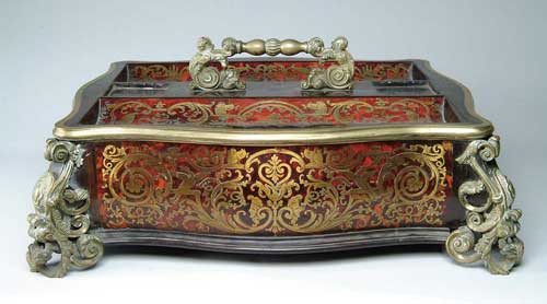 OUTSTANDING BOUELLE AND ORMOLU DECORATED DESK STAND. Large ink stand has grooves to hold two square inkwells. A large decorative handle in the center separates them. Two curved pen trays, one on each side, complete the top. A front serpentine drawer has no latch but pulls from underneath. The serpentine side box has large brass/ormolu corner feet with scrolls an leaf decoration. Brass bound top and all over brass inlay on a simulated tortoise shell background. Inlays incorporate classical motifs including scroll, faces, leaves, squirrels and birds. SIZE: 8” h (including handle) x 19” w x 16” d. CONDITION: Very good. One Phoenix bird brass decoration has lifted, otherwise very good. 9-98755 (2,750-3,250)