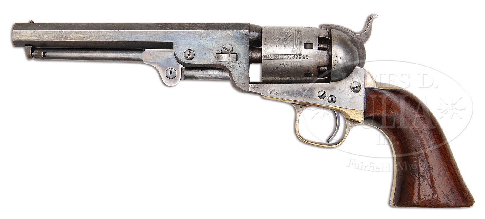 RARE EARLY 4TH MODEL SHORT BARRELED COLT MODEL 1851 NAVY PERCUSSION REVOLVER. SN 87225. Cal. 36. Rare Navy with 6-1/2″ oct bbl, brass pin front sight, and 1-line Hartford address with dashes. Left side of frame is marked with small Colt’s patent and the large guard silver plated brass trigger guard and backstrap contain a 1-pc walnut grip with last 4 digits of matching SN in backstrap channel. Cyl is usual 6 shots with Ormsby Naval Battle Scene and all 6 safety pins prominent and serviceable. SN on the rammer handle is of a smaller font than all the other numbers on the revolver and is parallel to the axis of the rammer handle. This disparity in font size has been noted on other Navy revolvers. Few of these shorter than normal Navys have ever been encountered and they are frequently referred to as “experimental”. It is known however that Colt offered extra length bbls at $1 per inch over 7-1/2″ and a few are known to have been ordered with shorter than standard bbls. PROVENANCE: Dr. John M. Pickup Collection. CONDITION: Fine, all matching, including wedge, cyl and grip. Bbl retains 60-70% orig blue with most of the losses from flaking, not wear, having only sharp edge wear. Rammer handle retains bright case colors on pivot with handle and rammer turned silver. Frame retains 50-60% fading case colors with recoil shield turned silver. Hammer retains dark case colors. Cyl is a gray metal patina and shows about 75% Ormsby naval battle scene. Trigger guard and backstrap retain silver in sheltered areas with balance a light mustard patina. Grip has chipped left toe and shows edge wear with light nicks and scratches and retains about 70% orig varnish. Mechanics are fine, strong bright bore with scattered pitting. 4-46416 JR89 (5,000-8,000)