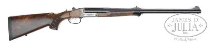 *BLASER S2 SAFARI LUXUS DOUBLE RIFLE WITH CASE. SN j02345. Cal. .470 Nitro. Unique Blaser system barrels have full length rib with raised matted portions at breech and for mounting of rear and front sights. Windage adjustable rear sight has broad white line under U-notch. Large gold bead front is pinned into rib. Breech portion of bbl is stamped “S 2 D B Blaser Germany” and with caliber and SN. Bottoms of bbls have German nitro proofs. Gray tone action with Blaser locking block push forward safety and cocking system has shaded open scroll engraving at about 30% coverage, with bottom marked “Blaser”. Nicely marbled and slightly stump figured European walnut full pistol grip buttstock measures 14-3/4″ over black “Universal” pad and features cheekpiece for right hand shooter, palm swell grip, ebonite grip cap with inset metal oval showing portrait of lion in relief, skip line point pattern checkering, and sling eye on toe line. Long semi-beavertail forend has large ebonite tip with Blaser system release. Drop at heel: Approx 2-1/2″, drop at comb: Approx 1-1/2″. Weight: 10 lbs. 12 oz, LOP 14-3/4″. High quality Blaser system aluminum case with velcro closed “Cordura” outer cover is lined in dark green velvet with space for this rifle and two additional bbls. Included are two Blaser marked gun socks and a keyed trigger lock. CONDITION: Essentially as new, with only a few minor marks on any and all surfaces, from carrying and use. Rifle has been fired. Case is excellent. 4-40242 MGM22 (8,000-10,000)