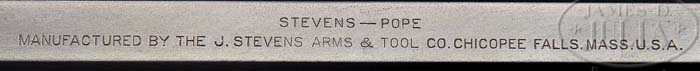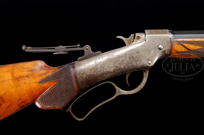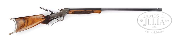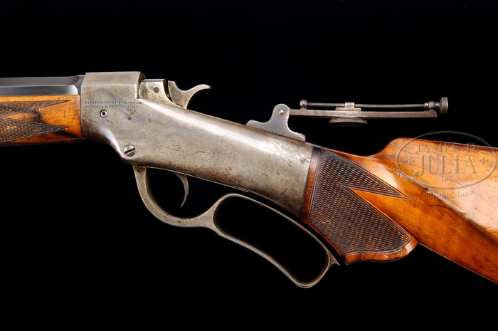 FINE POPE BARRELED BALLARD OFF-HAND TAKEDOWN TARGET RIFLE. SN 2416. Cal. 22 LR. Fine target rifle with 29″ oct to rnd bbl missing the front sight. Top flat is marked “STEVENS-POPE / MANUFACTURED BY THE J. STEVENS ARMS & TOOL CO. CHICOPEE FALLS, MASS. U.S.A.”. Bottom flat, under the forearm, has Pope’s markings consisting of a large “P / 591 / 20 / 1-24”. Bore has Pope’s trademark, left-hand rifling. Receiver has usual Marlin and Ballard markings with a tapered pin from side-to-side that engages the bbl root and when removed, allows removal of the bbl. Bbl is not cut for a rear sight and the top tang is mounted with a mid-range vernier sight with 4″ staff. It is mounted with matching Circassian walnut with checkered schnable tip forearm and serpentine grip buttstock with cheekpiece and a nickeled brass off-hand buttplate with medium prongs. Serial no. was observed in the usual place on bottom of receiver, inside toe of buttplate, on the face of the stock under the receiver and the last three digits on the rear face of the forearm under the receiver. Bbl is not numbered. Lever is full-loop style with single trigger and split breech block with firing pin retaining screw. CONDITION: Very Fine. Bbl retains about all of its orig Stevens Pope finish with only faint sharp edge wear. Receiver retains mottled smoky case colors being mostly a silver patina. Extractor is missing. Stock has the obligatory small crack in the wrist, otherwise wood is sound with a few chipped diamonds in the forearm checkering and usual light handling and use marks in the finish with a couple of gouges and bruises in the buttstock and overall retains most of its orig varnish finish. Mechanics are crisp, brilliant shiny bore. 4-39072 JR290 (3,000-5,000)
