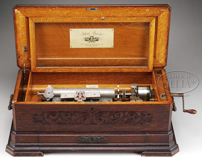 JACOT & SONS CYLINDER MUSIC BOX. Ideal Piccolo music box from the second half of the 19th Century is in a carved oak case and plays 11-1/4″ cylinders of which 7 are included (one on machine, 3 in locking drawer beneath, and 3 in extra case). Retains keys to drawer and lid. Single comb mechanism with zither attachment, ivory tags on lid and within box, hand crank, and book of tune cards. SIZE: 30-1/2″ l x 10-1/2″ h x 15″ d. CONDITION: Very good unrestored condition with no broken teeth. Few nicks and general wear, specifically to base, missing lock escutcheon and lid support is partially detached. Tone is very good. Exterior of box exhibits dark patina. Cylinders appear to be generally good to very good with a few bent pins. 1-9419 (3,000-4,000) Auction: Advertising, Toy & Doll - Spring 2009 Please Note: All prices include the hammer price plus the buyer’s premium, which is paid by the buyer as part of the purchase price. The prices noted here after the auction are considered unofficial and do not become official until after the 46th day. |