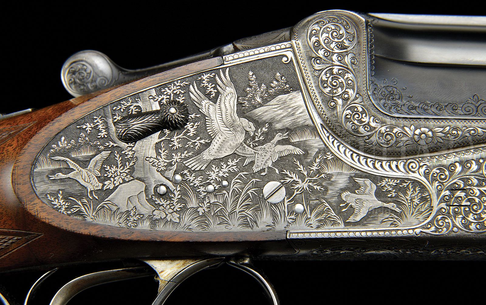 Correction: Gun is a 203E, not a 303E. It has a double underlug, not a double underbite as a 303E has. The engraving quality is, however , the type you might find on a 303. *MERKEL 303E SIDELOCK EJECTOR OVER-UNDER GAME GUN. SN 47189. Cal. 12 ga. 2-3/4″ Chambers. This fine, top of the line, Suhl made gun has 28″ demi-bloc bbls mounted with nicely matted ventilated rib, marked “Gebruder Merkel” and “Suhl” on left ejector boss. Bottom bbl is stamped with East German nitro proofs, with a proof date of February 1958, along with steel information and SN. Coin finished OU action features automatic safety, double Kersten locking bolt, raised rib tumbler end cocking indicators, reinforcing bolsters, H & H style lock detaching pin, and double triggers (front articulated). Action is engraved with well cut, attenuated, large, shaded scroll with some floral highlights. Bottom is marked “Gebruder Merkel Suhl”. Sidelocks are decorated with nicely detailed scenes of birds and dog; a trio of ducks erupt from woodland marsh (one hapless member being stooped upon by large hawk or eagle) on right lockplate; with trio of flushing woodcock being pointed by setter in open scrub land on left. Steel trigger guard is scroll engraved to match action. Well figured, and lightly streaked, dense European walnut long capped pistol grip buttstock measures 14-1/4″ over checkered wood butt, and features dainty shadow line right hand cheekpiece, sunburst horn grip cap, and point pattern checkering at grip with broad flat mullered borders. Matching three piece ejector forend has Deeley type release. Bore diameter: top -.729, bottom -.727. Bore restrictions: top -.028 (Imod), bottom -.010 (IC). Wall thickness: top-.033, bottom -.030. Drop at heel: 2-5/8″, drop at comb: 1-1/2″. Weight: 7 lbs. 4 oz. LOP: 14-1/4″. CONDITION: Excellent, retaining nearly all its orig finish on wood and metal, with only one or two faint marks in bbl blue. Coin finish slightly toned pleasingly, giving dramatic accent to engraving. Stock has a number of minor marks, one fairly heavy on left side near toe. Checkering darkened, but with little wear. A very fine and unusual Merkel. 4-48315 MGM24 (6,000-8,000)
