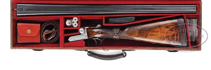 *CHARLES BOSWELL BOX LOCK PIGEON GUN WITH CASE. SN 16255. Cal. 12 Ga. 2-3/4″ Chambers. 30″ Dovetailed bbls with wide flat matted pigeon rib with cross bolt extension are engraved “Charles Boswell.” “Maker 126 Strand London.” on tops. Bbl flats show 1991 London reproof for 2-3/4″ chambers. Bottoms of bbls have provisional proofs, SN, and stamps for “M – Siemans Steel” in circular logos. Robust action has non automatic safety, cross bolt third fastener, and side clips. Action has 60% coverage of English scroll with “Charles Boswell” engraved on both sides. Trigger guard has scroll on bow, and SN on tang. Nicely marbled and lightly figured European walnut straight grip buttstock measures 15-1/4″ over leather covered pad, and features vacant silver oval, drop points, and 18 LPI checkering with mullered borders. Matching splinter forend has Anson release. Bore diameter: left -.732, right -.732. Bore restrictions: left -.026, right -.020. Wall thickness: left -.025, right -.031. Drop at heel: 2-1/4″, drop at comb: 1-9/16″. Weight: 7 lbs. 14 oz, LOP 15-1/4″. Original makers leather case has brass corners, and lid is embossed “V J. Rhodes”. Interior is lined in wine colored cloth with leather Boswell label, and new paper label with particulars of this gun. Accessories include 2-pc wooden cleaning rod, snap caps, oil bottle, leather wallet with cleaning brushes, and another leather covered pad with plugs. Also included is the rod to convert safety back to automatic. CONDITION: Fine, as re-conditioned. Bbls retain virtually all of an excellent quality re-black, with engraving picked up. Action is coin finished. Floor plate, trigger guard, and top lever have been re-blued, and retain most of that blue. Stock retains nearly all of a hand rubbed oil finish. Checkering has been re-cut. Action is tight. Bbls are on face. Bores are excellent. Case is fine. Leather is dark with a number of rubs and abrasions. Interior is fine. Label has a couple of rubs from contact with action. Accessories are new. 4-38325 MGM83 (4,000-6,000)