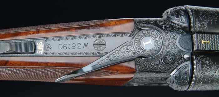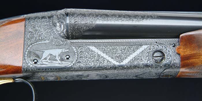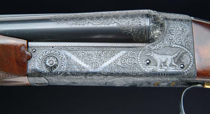 *SPECTACULAR CASED MATCHED SET OF CONNECTICUT SHOTGUN MFG. CO. WINCHESTER MODEL 21 PIGEON GRADE DBL BBL SHOTGUNS. Cal. 16 ga. SN W38190 & W38191. Numbered “I” and “II” respectively. These beautiful shotguns are identical in every respect with 30” bbls choked FULL/MOD with raised, flat, matted, tapered, ventilated ribs, Bradley red ivory beads & their respective numbers in gold at breech end of ribs. They have ejectors & sgl selective triggers. Water tables, bbl flats, lugs, standing breeches & breech faces are beautifully jeweled. Mounted with extremely beautiful, feather crotch cut, American walnut with custom checkered beavertail forearms with black tip inserts & straight stocks, 14-1/4” over checkered butts. They have blank gold initial plates on bottom of stocks. They are identically engraved in 21-6 patterns consisting of a setter on left, a pointer on right & two pheasants on bottom, all surrounded with very well executed, deep foliate arabesque patterns. Engraving extends 2-3/4” up bbls. Triggerguards have a spaniel’s head. Opening lever pivots & tip of forend irons have gold inlaid “I” and “II” respectively. Top tangs have “SAFE” in gold & bottom of receivers have “PIGEON GRADE” in gold. Gun #I: Drop at heel: 2-1/2”, drop at comb: 1-1/2”. Gun #II: Drop at heel: 2-1/4”, drop at comb: 1-1/2”. Gun “I” weighs 7 lbs. 9.92 oz. and Gun “II” weighs 7 lbs. 8 oz. Accompanied by their orig, chocolate brown, leather covered, oak & leather, red felt lined, trunk case, compartmented in bottom for both shotguns. CONDITION: Exceptionally fine, appear to be new & unfired retaining all of their orig factory finish to both metal & wood. Blue is strong & bright and wood finish crisp & fine. Both have been assembled with minor scrape marks on standing breeches but appear unfired. Case is equally new. 4-30536 JR342 (22,500-27,500)