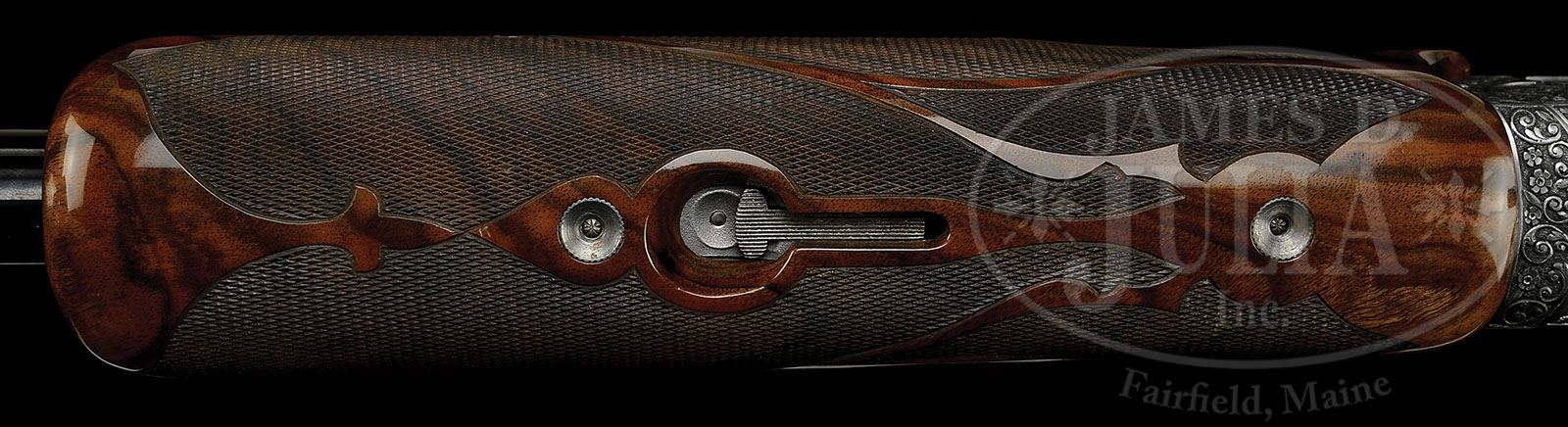 *SUPERB CUSTOM KRIEGHOFF K 32 ANGELO BEE ENGRAVED, WITH DOCKWEILLER STOCK, EXTRA BARRELS, TUBE SET, AND CASE. SN 269. Cal. 12 ga. 3″ Chambers. 26″ and 28″ Bbls, both with raised, matted, ventilated ribs. 26″ Bbls are marked “H. Krieghoff K. G. Ulm, Germany”, “Model 32 Skeet 12 Ga”, and “Bohler Laufstahl” on left side of top bbl. Bottom of mono-bloc is stamped with SN and Ulm proof date of 3/59. Later 28″ bbls have broader rib, are fitted with interchangeable choke tubes. They are ported, and marked “Bohler Laufstahl” on top left, and with Krieghoff Ottsville, PA, import mark on bottom. Both bbl sets are stamped for 70 mm chambers. Coin finished typical Model 32 action features single selective trigger, and blocked out safety for target shooting. Top of mono-bloc and action are profusely engraved with very well cut, sculpted, and shaded, large, flowing, open scrolled acanthus with small, floral highlights, framing semi-relief, gold inlaid, vignettes of Diana, Goddess of the Hunt, with her bow and hound in various poses, all in woodland settings. This fine work is by noted engraver, Angelo Bee, whose signature appears at the bottom of left side action scene, and on trigger plate, which is also stamped with his bee logo. Strikingly figured European walnut full capped pistol grip buttstock measures 14-1/2″ over black Decelerator sporting clays pad. Borderless checkering is of fleur-di-lis type with many ribbons through pattern and fancy border. Ebony flared grip cap with white line spacer has gold lozenge engraved “TL” and with J. Dockweiller Gunsmiths information around outer perimeter. Matching one piece full beavertail forend has Deeley type release. 26″ Bbls: Bore diameter: top -.732, bottom -.732. Bore restrictions: top -.001 (Skeet), bottom -.001 (Skeet). Wall thickness: top-.041, bottom -.030. Drop at heel: 1-15/16″, drop at comb: 1-1/2″. Weight: 8 lbs. 0 oz. LOP: 14-1/2″. 28″ Bbls: Bore diameter: top -.731, bottom -.731. Bore restrictions: Screw chokes. Wall thickness: top-.045, bottom -.043. Drop at heel: 2″, drop at comb: 1-9/16″. Weight: 8 lbs. 7 oz. LOP: 14-1/2″. Americase Premium aluminum case with double latch and combination lock, has space in bottom for gun, forend, and two sets of bbls. Top compartment holds fine quality tube set, with two tubes for 20 ga, 28 ga, and .410, with an additional 28 ga set fitted for screw chokes. Case contains blue plastic case with three extra choke tubes (two are in gun) and wrench, along with gun sock, two empty Crown Royal bags, and two keys. CONDITION: Excellent, showing almost no use since custom work performed, retaining essentially all of its fine custom finishes on wood and metal, with only the faintest of marks. Ejectors are weak. 4-48361 MGM67 (8,000-12,000)