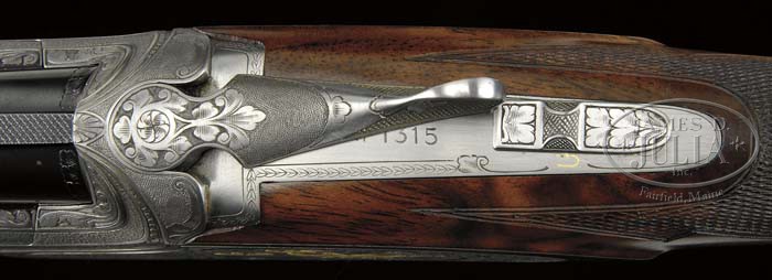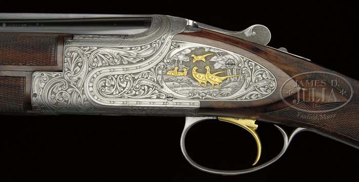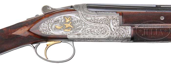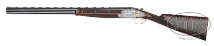 *28 GAUGE BROWNING SUPERPOSED PRESENTATION IV SUPERLITE WITH GOLD “ALL OPTIONS”. SN P73RP1315. Cal. 28 ga. 2-3/4″ Chambers. This exceptionally rare gun (approx. 20 manufactured) has 26-5/8″ bbls with narrow, flat, matted, ventilated rib, bbl is marked with Utah and Montreal addresses, and “Made in Belgium” on left top bbl, and with “Browning Superposed” as well as gauge, chamber, and patent information on right. Coin finished side plated action is fitted with selective single trigger, and engraved with very finely executed semi-relief large scrolled acanthus framing gold inlaid vignettes of game; 5 pheasants in open woodlands on left lockplate, and quatro of mallards in marsh on right. A quail skims through woodlands on bottom of action, and a gold dog’s head is on trigger guard bow. This is the work of C. Baerten, whose signature appears at bottom of woodlands scene on left lockplate. Lightly marbled and spectacularly flame-figured European walnut straight grip buttstock measures 14-3/8″ over skip line checkered wood butt with screw affixed plug covering weight reduction hole. Three piece matching forend has Schnabeled tip. Bore diameter: top -.540, bottom -.540. Bore restrictions: top -.010, bottom -.006. Wall thickness: top -.042, bottom -.043. Drop at heel: 2-1/8″, drop at comb: 1-7/16″. Weight: 6 lbs. 8 oz. LOP 14-3/8″. Gun comes with Browning leatherite case, lined with fuzzy fawn colored faux fleece. PROVENANCE: Browning letter confirming all specifications of this gun. CONDITION: Excellent, near new, with only the slightest of silvering on bbls at muzzles, and a few minor marks. Coin finish has toned slightly over the years. Stocks retain nearly all their orig rubbed oil finish with a few very minor marks and rubs. Bores are excellent. Action is tight. Ejectors are in time. Case is excellent, hardware toning. Interior is excellent. 4-42394 MGM186 (40,000-50,000)