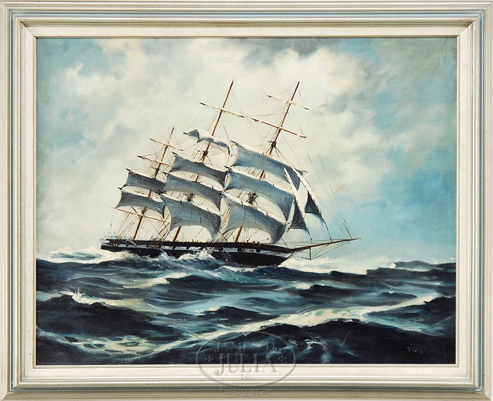 ATTRIBUTED TO VIVIAN FORSYTHE PORTER (American, 1888-1982) “THE DANIEL WEBSTER”. Oil on canvas nautical scene shows a three-mast ship in half sail sailing left to right in rough seas. Signed lower right “T. Bailey” but having an old typed and written attribution on reverse. It is known that paintings signed by ” T. Bailey” were probably done by a trio of artist’s who resided together in Winthrop, MA. The ship portrayed here was built in 1858 and lost at the Cape of Good Hope. Housed in a decorative frame with linen and silver liner. SIZE: 22″ x 28″. PROVENANCE: Collection of Elwyn Dearborn, Medford, NJ & Portland, ME. CONDITION: Very good. 9-96273 (300-500)
