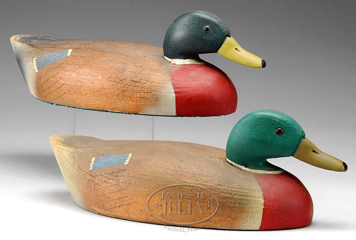 PAIR OF CARVED AND PAINTED MALLARD DECOYS. Paper on bottom indicates that these are circa 1940, Wild Fowler Mallard ducks from Old Saybrook, CT. SIZE: 5-1/2” h x 15-1/2” l. CONDITION: Very good. 9-27014 (75-125)