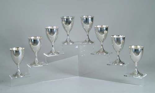 SET OF EIGHT STERLING GOBLETS BY SCHOFIELD & CO INC. Number 165. SIZE: 6” h. CONDITION: Very good. 9-99730 (600-800)