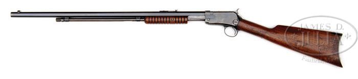 *WINCHESTER 1890 THIRD MODEL SLIDE ACTION RIFLE. SN 647723A. Cal 22 LR. 24″ oct bbl fitted with standard model 90 sights, number 30-A rear, number 75A front. Standard markings on bbl and top tang. Blue finished metal parts. Grooved forearm and straight-hand stock of straight-grain American walnut having crescent steel buttplate. CONDITION: Very good. Bbl retains 90-95% blue. Magazine tube has good blue in protected areas having flaking to patina in exposed areas. Receiver and trigger guard have 30% blue with balance flaking with age. Buttplate has 70% blue with fine scratches. Sound stock and forearm having orig finish showing normal wear with scratches, some small dents and handling marks. Smooth action. Bore is bright with very good rifling. 4-46831 DS1 (1,250-1,750)