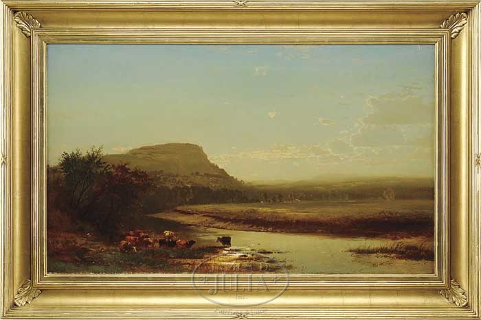 ARTHUR PARTON (American, 1842-1914) ON THE HUDSON. Outstanding large oil on canvas New York landscape scene shows a foreground river with a small herd of cows beside and taking shade under nearby trees. The river winds through the valley scattered with tree lined fields and houses leading to far away mountains. On the left is a steep sided mountain, closer than the rest. All under an expansive sky from blue to light yellow/blue. Housed in a fine reproduction antique style gilt wood frame. SIZE: 24″ x 40″. CONDITION: Very good. Relined, minor chips to top edge, some minor inpainting to edges and spots in sky. 9-99989 (12,000-18,000)