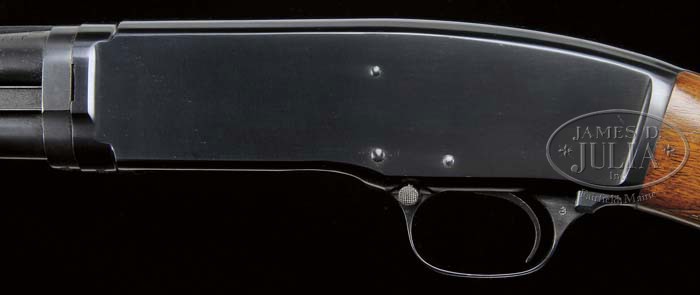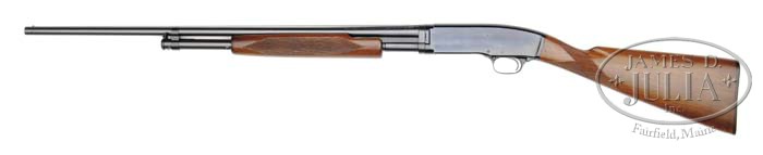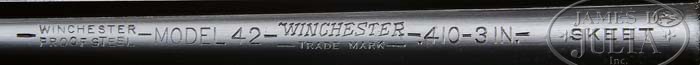 *DESIRABLE WINCHESTER MODEL 42 SKEET WITH SOLID RIB. SN 46351. Cal. 410. 26″ bbl, with matted solid rib with sgl silver sighting bead, 3″ chamber and skeet choke. Left side of bbl is marked “WINCHESTER/PROOF STEEL-MODEL 42-WINCHESTER/TRADEMARK-.410-3IN.-SKEET”. Right side marked “MADE IN U.S.A. WINCHESTER REPEATING ARMS CO./NEW HAVEN.CONN.-PATENTS PENDING”. Standard receiver with serrated top, mounted with lightly figured straight grain walnut, checkered straight grip, Winchester hard rubber buttplate, skeet forend with checkered side panels. LOP: 13-7/8″, Weight: 6lbs. CONDITION: Extremely fine. Metal surfaces retain nearly all of their factory orig blue, with a couple minor light handling marks, faint rub mark on side of bbl from forend, and silvering on sharp edges of action bar. Stock is sound with sharp checkering, some minor handling marks and retaining nearly all of its orig finish. Forend is sound with sharp checkering, a couple minor handling marks and retaining its orig finish. Mechanics are crisp with a bright shiny bore as gun appears to have seen very little use. 4-41031 BDT18 (4,000-6,000)