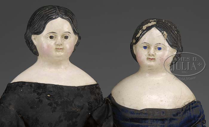 PAIR OF TWIN PAPIER MACHE DOLLS. Papier mache molded shoulder head dolls with molded and painted features; one with brown eyes and the other with blue on so-called “milliner’s model” type bodies made with firm leather and narrow waist with wooden arms and legs with painted shoes. Both wear what appears to be original costumes with off the shoulder blouses, original undergarments made of cheesecloth and one still retaining original green cheesecloth skirt with black velvet ribbon trim. SIZE: Each are 19-1/2″ (50cm). CONDITION: Very good to good; typical crazing and paint loss in spots on heads. One of the green shoes has significant chip. 1-11262 (600-1,000) Auction: Advertising, Toy & Doll - Fall 2011 Please Note: All prices include the hammer price plus the buyer’s premium, which is paid by the buyer as part of the purchase price. The prices noted here after the auction are considered unofficial and do not become official until after the 46th day. |