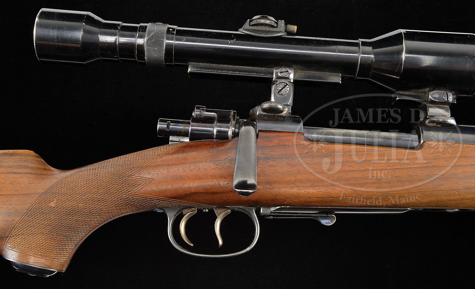 *UNUSUAL MAUSER TYPE B SPORTING RIFLE WITH SCOPE. SN 104390. Cal. 8 x 60 Magnum. Typical type “B” rifle having late style 24″ bbl, with three leaf rear sight, sleeved-on sling loop, and long checkered front ramp, which is somewhat different in that it is fitted with a push-button detent to make longitudinally dovetailed beads easily interchangeable. Standard length action is marked “Waffenfabrik Mauser – Oberndorf A/N” on left side, and has been fitted with claw scope bases. The bolt, with matching numbers to action, is unusual in that it has a type “M” butter-knife handle. Bottom metal has typical lever release to hinged floorplate, and is fitted with double set triggers. Well figured European walnut stock has standard cheekpiece, checkering, and steel grip cap, but is fitted with type “M” steel buttplate with trap, the cover of which is engraved with Mauser logo. Hensoldt Duralyt 6 X rail scope with three post reticle is fitted with claw mounts, rear mount adjustable for windage. Drop at heel: approx 2-3/4″, drop at comb: approx 1-5/8″. Weight: 8 lbs. 4 oz. LOP: 14-3/4″. CONDITION: Excellent, retaining 85 – 90% orig blue, and most of its orig stock finish, both with a number of minor marks from normal handling and use. Lacquer finish of scope is in same basic condition. Optics are clear. Bore is excellent, bright and shiny with sharp rifling throughout. The 8 x 60 mag approaches the .300 H & H mag in ballistics. A neat, specially ordered rifle easily converted to 8mm/ 06. 4-48677 MGM6 (3,000-5,000)