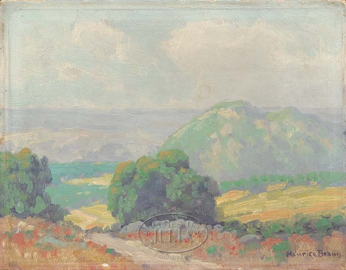 MAURICE BRAUN (American, 1877-1941) CALIFORNIA VALLEY. Unframed oil on artist board scene shows a view looking down a valley with green top mountain and foreground of red flowers flanking a path. Light blue and white cloud sky. SIZE: 7″ x 9″. CONDITION: A cleaning will brighten painting, otherwise very good. 9-91222 (5,000-8,000)