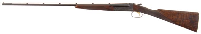 *CONNECTICUT SHOTGUN MFG. CO. WINCHESTER MODEL 21 DOUBLE BARREL SHOTGUN. Cal. 410. SN W38082. Beautiful “21” with 30” Winchester proof steel bbls, choked FULL/FULL with flat, tapered, matted ventilated rib with Bradley red ivory bead, ejectors & gold plated sgl selective trigger. Rear of rib is marked “CUSTOM BUILT”. Mounted in exceptional, feather crotch cut, American walnut with deluxe checkered, black insert, beavertail forearm & straight stock, 14-1/8” over a checkered butt. It has a blank gold initial plate on bottom. Receiver is beautifully engraved in 21-4 pattern with two ducks on left side, two quail on right side and two bird dogs on floorplate, surrounded by light foliate arabesque patterns. Receiver & floorplate have chain & dot border patterns. Receiver & bbl flats have lightning cuts. All of bright metal is nicely jeweled. Unable to gauge bore diameter, bore restrictions, or wall thickness. Drop at heel: 2-1/8”, drop at comb: 1-3/8”. Weight: 7 lbs. 1.92 oz. CONDITION: Extremely fine, has been fired, but very little. Bbls & receiver retain virtually all of their beautiful factory finish. Wood is sound with a deep scratch at toe & very light handling & use marks elsewhere with crisp checkering. Mechanics are crisp, brilliant shiny bores. 4-30538 JR411 (17,500-27,500)