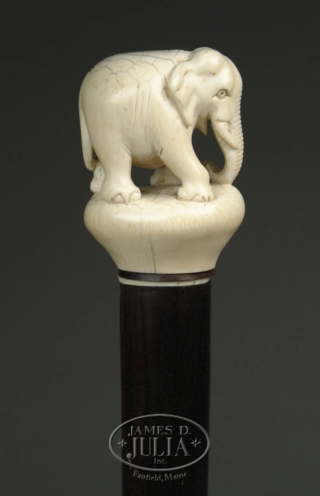 LARGE HEAVY CARVED IVORY ELEPHANT CANE. Piece carved elephant stands atop a carved ivory knob with flat top. Thin ivory ring below a dark ring as collar. Thick rosewood type tapering shaft end sin a 1-1/4” ivory worn ferrule. SIZE: 36” l. Handle is 3” x 2-1/4”. CONDITION: Very good. 9-28183 (1000-1500)