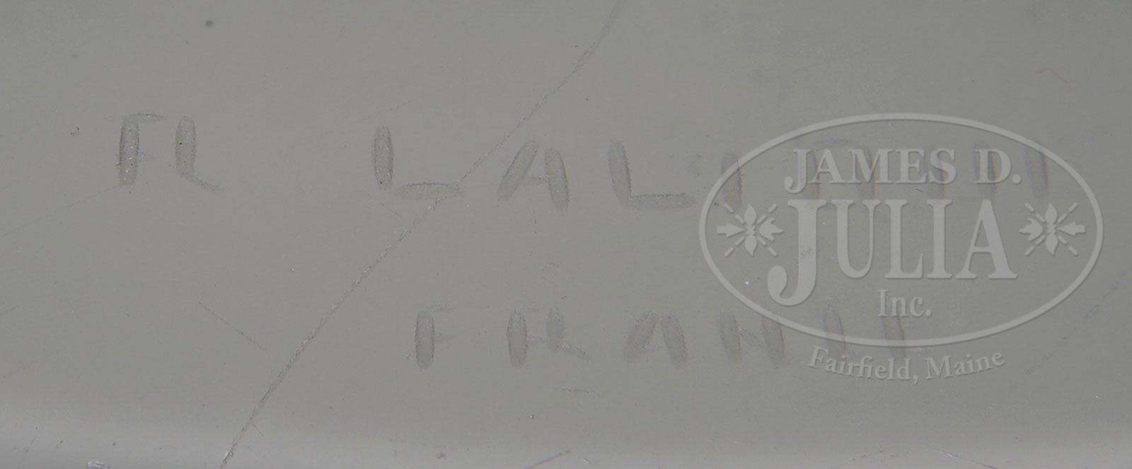 R. LALIQUE ACANTHUS JARDINIERE. The frosted glass boat shaped jardiniere has impressed acanthus leaf decoration at each end. The jardiniere is signed on the underside with engraved block letters “R. Lalique France”. Marcilhac #3460, pg. 773. SIZE: 18″ l. CONDITION: There is an open air bubble on the interior bottom of the jardiniere from the making, otherwise very good to excellent. 5-66861 (800-1,200)